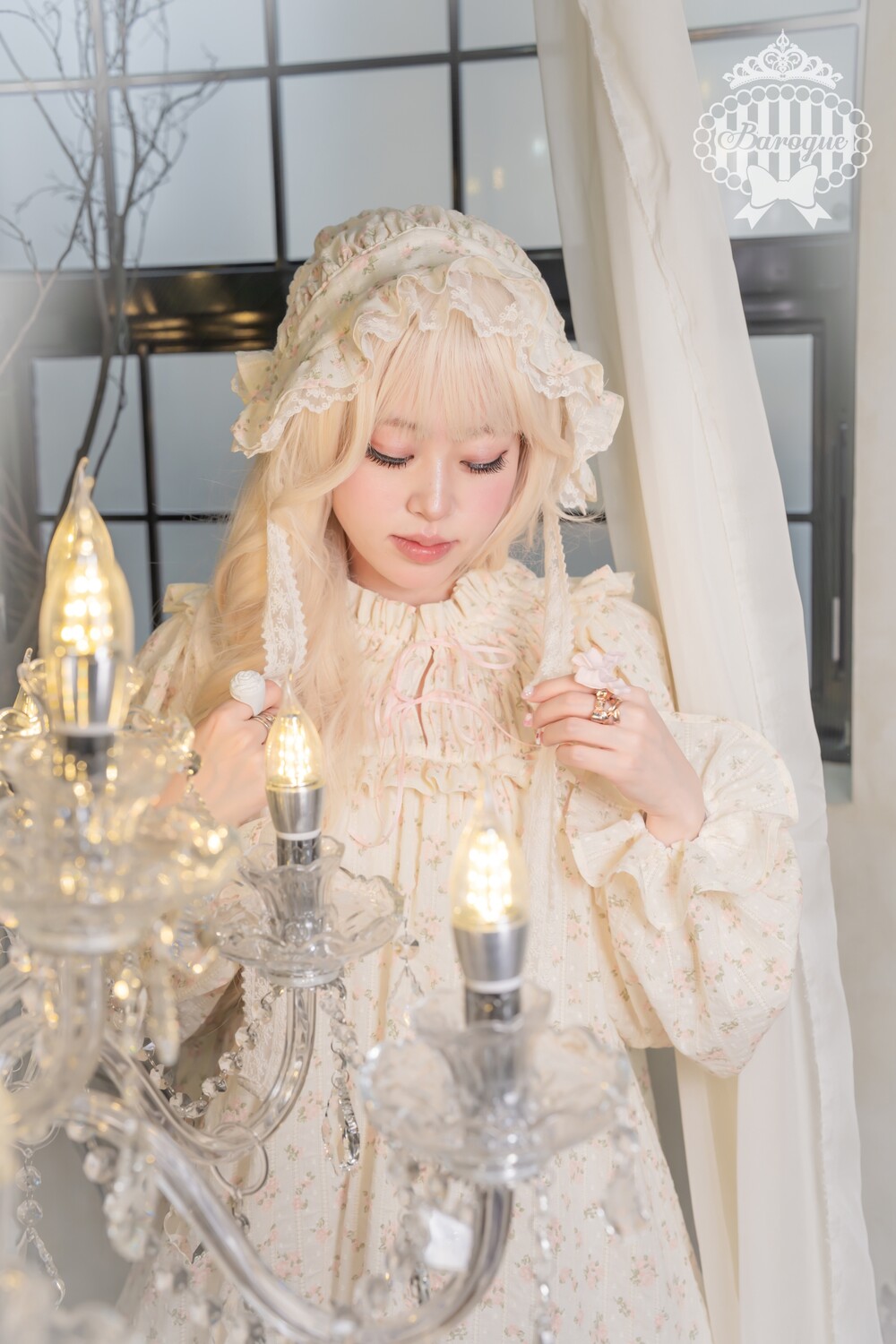 프릴과 레이스를 이마와 헤어라인으로 당겨 착용하면 <나이트캡>의 형태로 착용이 가능합니다.