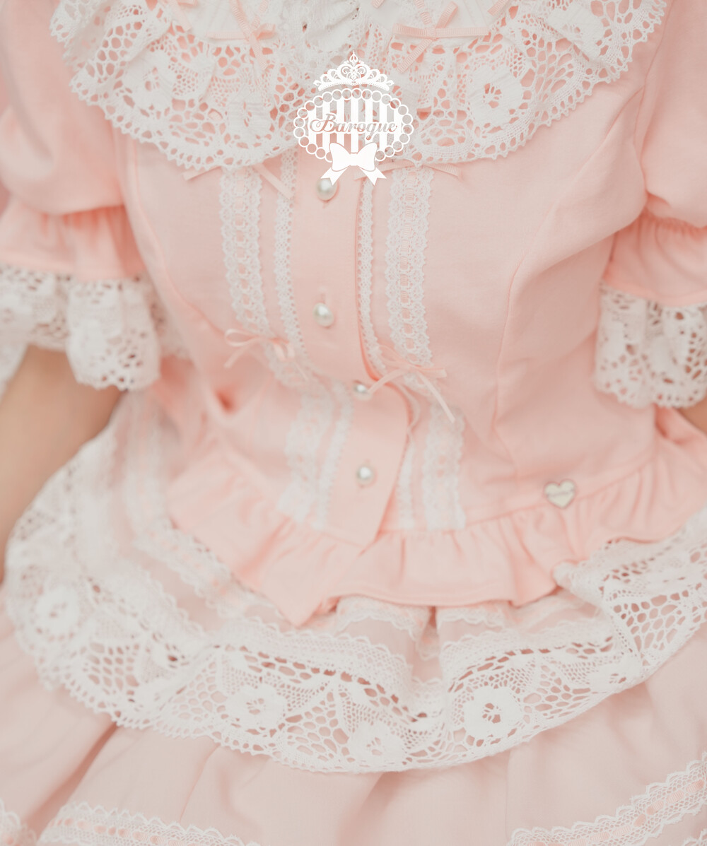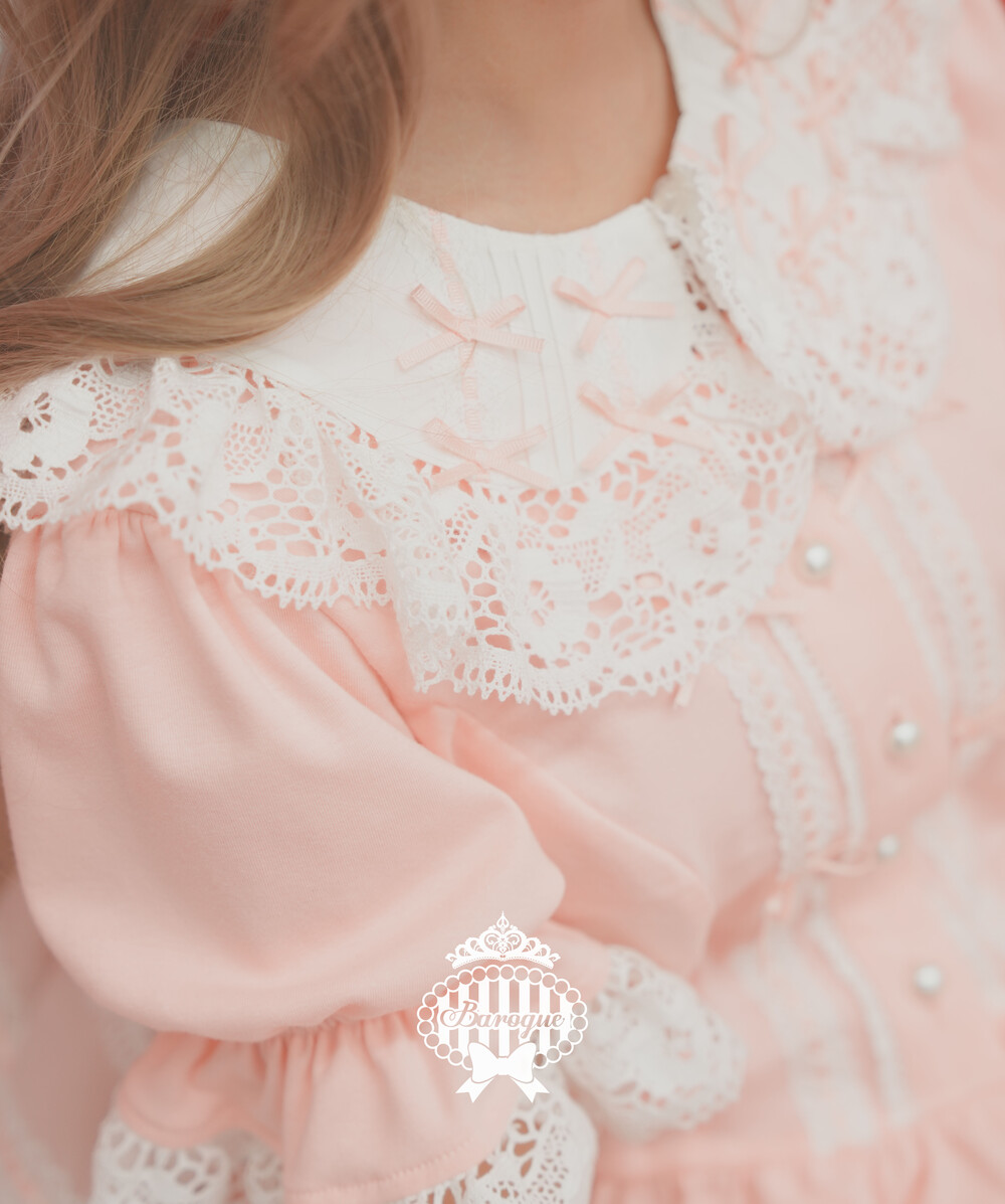 핀턱과 자잘한 레이스, 리본에 넓은 토션레이스가 둘러져 돋보이는 디자인 입니다.